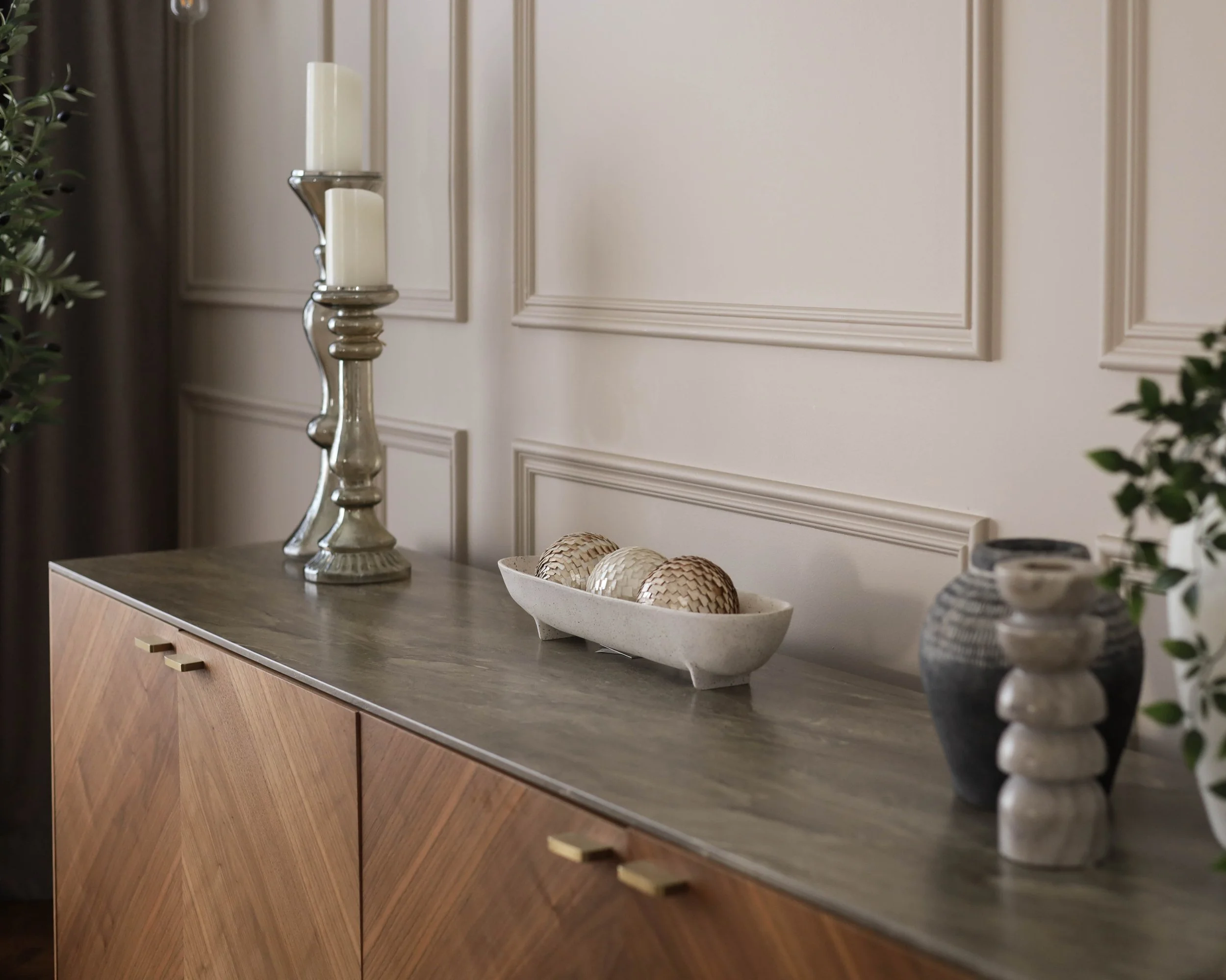 Pour ce projet, nous avons retravailler tout le rez-de-chaussée. Ce qu’on vous montre ici c’est surtout le séjour et la salle à manger. Nous avons crée des bibliothèques et rangement sur-mesure de chaque coté du foyer et avons donné un peu plus de vie à la salle à manger.